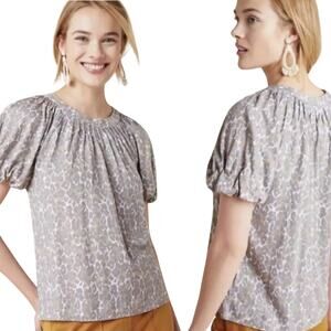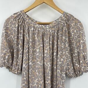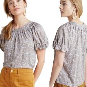 Anthropologie Maeve Leopard Print Linen Top Puff Sleeve Scoopneck Gray Medium