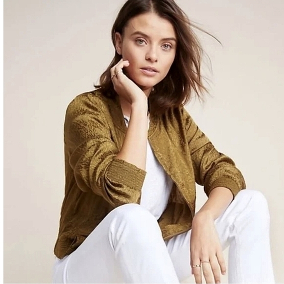 Cute lightweight olive green bomber jacket by maeve from anthropologie. Elastic hem and cuffs, full zip, front pockets. Care and material tag cut.