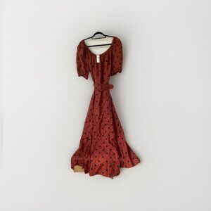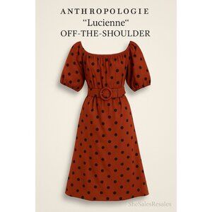 The Anthropologie Maeve Lucienne Maxi Dress is an effortlessly chic statement piece with playful elegance. Designed in a warm rust-brown hue with bold black polka dots, this off-the-shoulder silhouette flatters with puff sleeves, a fitted waist, and a full flowing skirt. The matching belt with a circular buckle adds a polished finish.