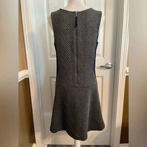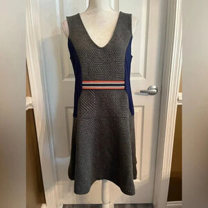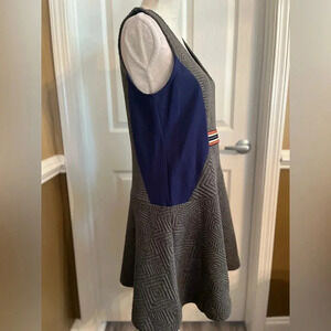 Anthropologie Maeve Ludlow Quilted Dress, size medium. Colorblock gray-blue quilted dress. Sleeveless, v-neck,back zip. Drop waist style. Works on its own or layered with a blouse/button up shirt for more coverage.