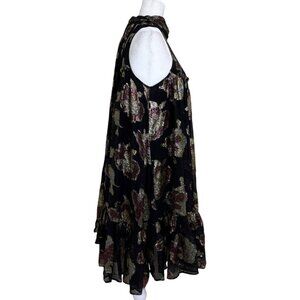 NEW with tags! A luxurious black chiffon dress adorned with intricate metallic floral patterns in gold, silver, and rose gold. The halter neckline and flowing silhouette create a sophisticated evening look with dramatic ruffled hemline.