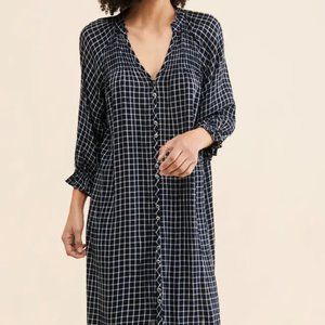 Anthropologie Maeve Navy Blue & White Sara Smocked Dress - Navy blue and white with red stitching, Woven in a modern grid pattern with smocked details, sweetly ruffled cuffs, this versatile shirtdress is sure to be a year-round essential. Missing the cinchable belt. 3/4 long ruffled sleeves with V neck, Smocked details at yoke and back, Button front
