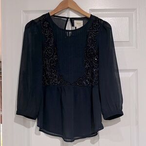 Anthropologie Maeve Navy Sheer Blouse with Embroidered Details