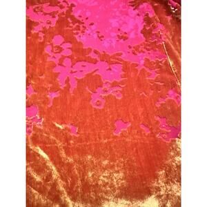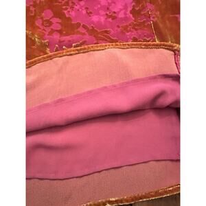 The Anthropologie Maeve Ombre Shimmer Tee Top Blouse in size XS features a floral design in pink and gold hues, giving it a shimmery ombre effect. Made from a lightweight silk blend chiffon material, the blouse has a square neckline and flutter sleeves for a feminine touch. This casual top is perfect for all seasons, offering a breathable and comfortable fit with a regular silhouette. The delicate metal-themed pattern adds a stylish flair to this basic blouse from the Maeve brand.