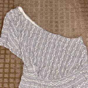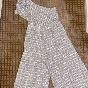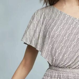 Throw on and go, no zips or buttons. jaime, anthro jumpsuit, jumper, anthropology, ruffle sleeve, short sleeve, flutter sleeve, palazzo pants, boho, indie, cottagecore, prairie, wine tasting, asymmetrical, off the shoulder, capri, vacation, airy, breezy, comfortable, flirty, brunch, shower, office, day to night, goddess, tribal, feminine, unique, eccentric, bohemian, transitional. Add flats and a cardigan for work or dazzle it up with earrings and wedges! Allover geometric/aztec pattern. Black and ivory. Size Medium. Excellent condition.
