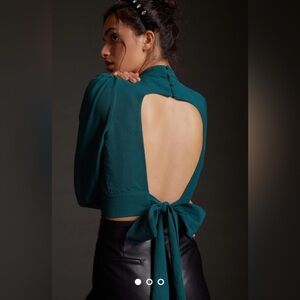 The Anthropologie Maeve blouse just sold out online. Looking for a blouse that's a cut-*out* above the rest? Opt for this stylish open-back piece, where a skin-baring silhouette offers playful sophistication. It is brand new with tags with a tie bow below the open back. It is a stunner.