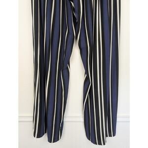 Features and description: pants; wide leg; striped; full side slits; tulip hems; navy blue black and white