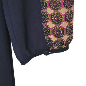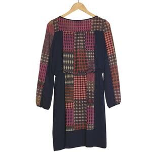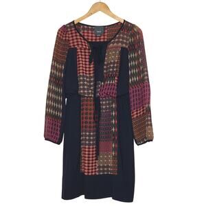Anthropologie Maeve Peasant Patchwork Print Boho Dress Mini Navy Blue Red Tan XS