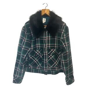 Anthropologie Maeve Plaid Faux Fur Collar Cropped Jacket Green Black Size L NWT