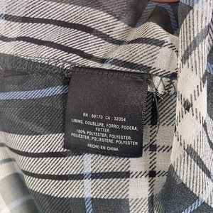Color: Blue, black and white sheer plaid print. Silver metal buttons.