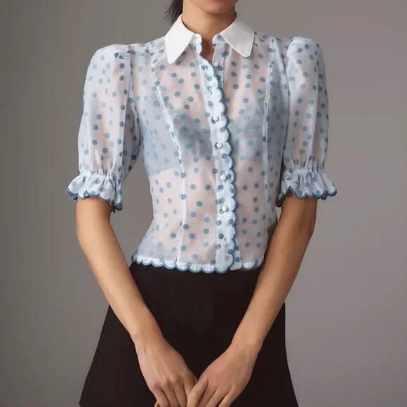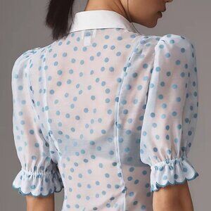 Anthropologie Maeve Puff-Shoulder Collared Slim Blouse in Blue Motif, S