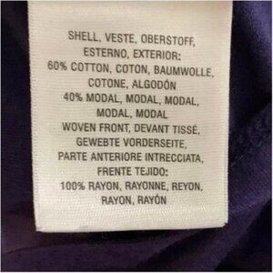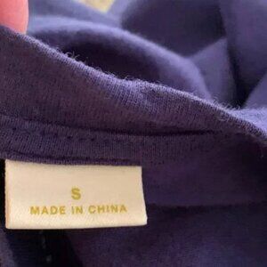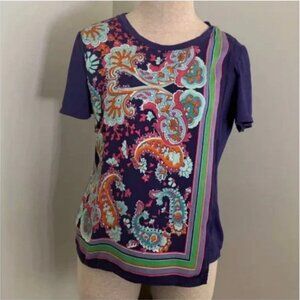 Short sleeve crewneck tee. Paisley scarf print layered. Cotton, modal, rayon blend.