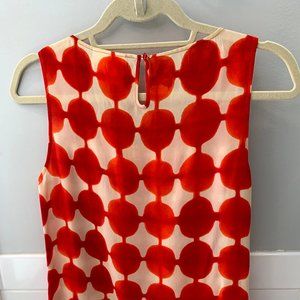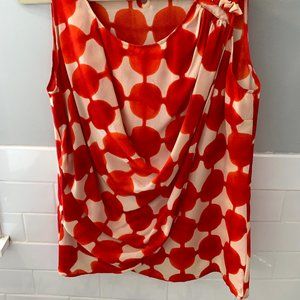 A gorgeous silk sleeveless top with orange/red dot pattern and draping in the front. Button at the back of the neck with keyhole opening. Excellent used condition, and great for work. 100% silk