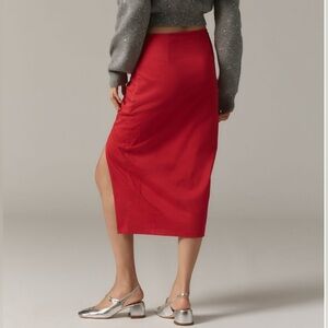 This red Maeve midi skirt features a front slit with embroidered bow detail and a sleek, flattering fit. Perfect for holiday parties or a polished pop of color.