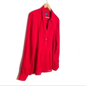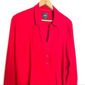 Excellent condition! Red. Business day to weekend style in a flash in Maeve from Anthropologie. Chiffon unlined popover blouse with Swiss texture detailing around the bust. Half button up.