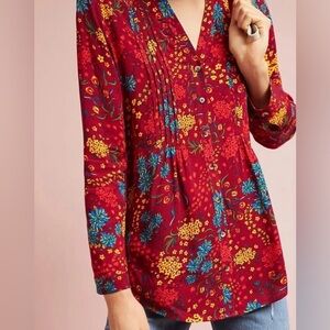 Anthropologie Maeve Red Floral Viscose Button Printed Pintucked Blouse Sz S
