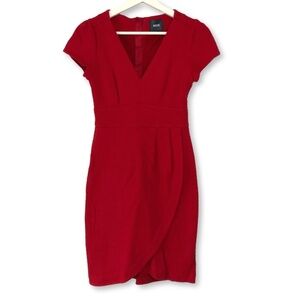 Anthropologie Maeve Splitshade red textured tulip wrap hem V-neck short sleeve dress with an exposed back zipper and a slim silhouette. Lined with cap sleeves. Perfect for wedding guests, 4th of July, the office, career events, a night out, date night, church, brunch, parties, summer, or holidays.