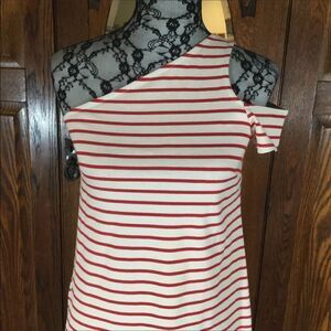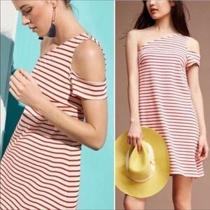 Maeve for Anthropologie Red and White Stripe one shoulder, 100% Cotton dress, hidden aqua trim, cold shoulder with the short sleeve, size XS in great preowned condition. Approx. 34” long, 34” chest, 34” waist, 40” hip. Happy to answer questions, thanks!