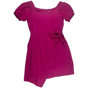 This is a pre-owned Maeve by Anthropologie dress, size US 16. The dress is a vibrant pink color and features a square neckline and short, puffed sleeves. It has a wrap-style front with a tie at the waist. The dress is approximately 34 inches in length and 20 inches across the chest. A zipper closure is located at the back. There are no visible stains and a very small hole in the back as shown in the picture