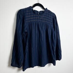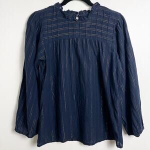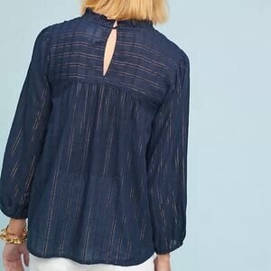 Anthropologie Maeve Reston Blouse Small Navy Blue Gold Metallic Semi Sheer