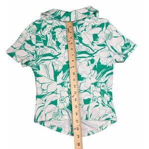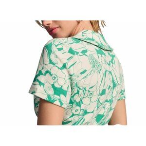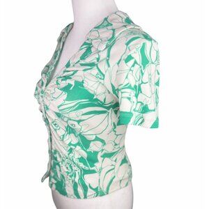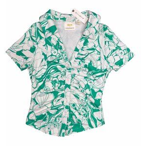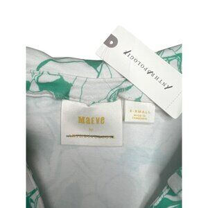 This Maeve blouse, crafted for Anthropologie, features an elegant ruched design and a vibrant floral pattern. The lightweight cotton blend fabric ensures comfort and breathability, while the button-down front and short sleeves offer a classic silhouette suitable for various settings. Its green and white palette adds a refreshing touch to the wardrobe.