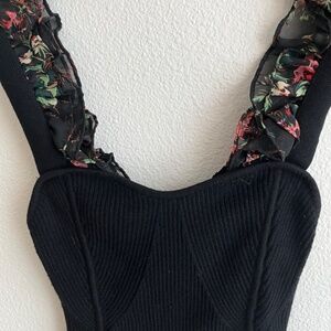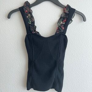 Unique sweater tank with ruffle straps patterned in floral and vines.