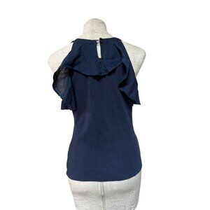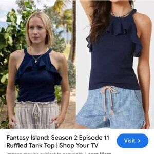 Anthropologie Maeve Ruffled Rib Halter Tank Top offers a sleeveless blouse in navy blue. This flounce neck top, as seen on TV's Fantasy Island, epitomizes cool girl, celebrity style.