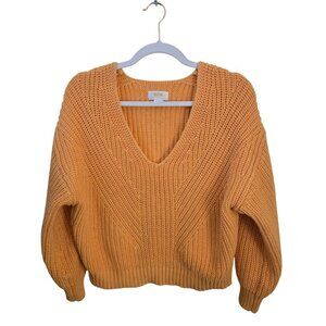 This Anthropologie Maeve pullover sweater in sherbet orange is a chic and cozy addition to your wardrobe. With its oversized fit and chunky knit, it offers both style and comfort for any casual outing.