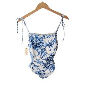 Anthropologie Maeve Shirred Tie-Shoulder Tank in Blue Floral Print NWT