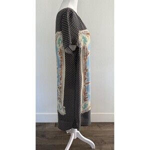 The Anthropologie Maeve Silk Dress in size L features a unique sketchbook style design inspired by world sites and travel. Made from luxurious silk material, this short sleeve dress has a round neck and a pullover closure. It is perfect for casual, business, or travel occasions, with a shift style that combines art, bohemian, and city themes. The dress is lined and accented with a button closure making it a versatile and stylish addition to any woman's wardrobe. Hand wash only to ensure care and maintenance of this gray silk dress from Anthropologie.