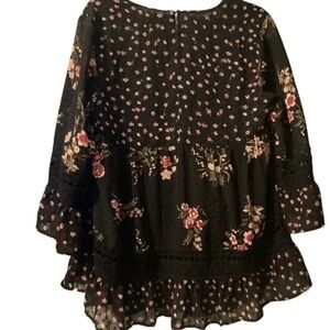 For Maeve by Anthropologie comes the Steffy Bell sleeve blouse in a black floral print Peasant style blouse in size small. Features a mixed floral print on swiss dot, v neckline, lace insert 1/2 bell sleeves, fully lined bodice, sleeves feature crochet lace insets as well as lower front of blouse, soft pleating, ruffle accent hem, keyhole back closure.Measurements bust flat 19" length 26". Fabric 100 % polyester.