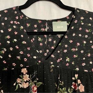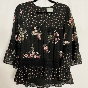 Beautiful floral print bell sleeve blouse with lace inserts on sleeves and bottom.
