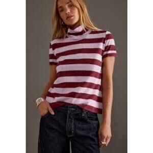 Anthropologie Maeve Striped Mock Neck Tee top short sleeve Pink Red fall XS