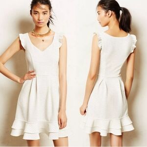 Anthropologie Maeve Sunland Striped V-Neck Flutter Knit Dress, Ivory and micro black pinstripe, Size 2.