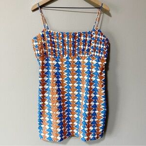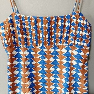 Brand new with tags Maeve for Anthropologie The Ophelia Sleeveless Linen Slim Mini Dress in Blue Motif (a blue, rust brown, and ivory geometric print). Size 14. Adjustable spaghetti straps. Lined. Pleated front and smocked back. Side zip closure. Retailed for $148. NWT.