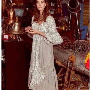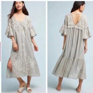 Anthropologie Maeve Tisdale Embroidered Tassel Midi Dress Women 6 Oversized Gray