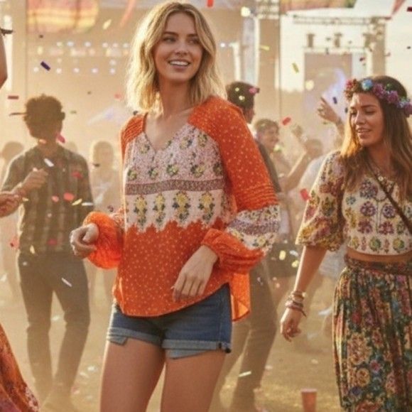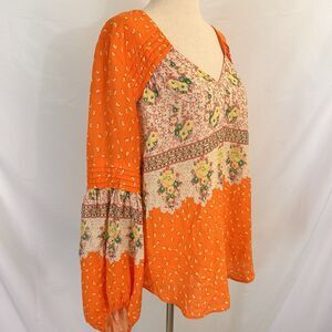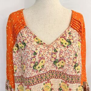 Indulge in the bohemian allure of Anthropologie with this charming Maeve Ceresco Orange Floral Pleated Peasant Top in a size M.