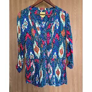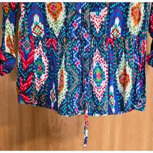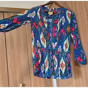 Anthropologie Maeve Topoxte Geometric Ikat Button Front Drawstring Tie Waist Blouse Top, size 2. In very good prelove condition. Mild fading is noted - see pictures, especially last pic. Otherwise, no flaws were noted.