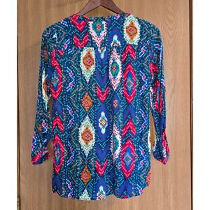 Keywords: Anthropologie, Maeve, geometric, colorful, blouse, workwear, office, business attire, versatile, boho chic, bohemian, southwestern, western, cowgirl, casual, summer, travel, vibrant