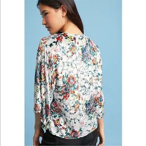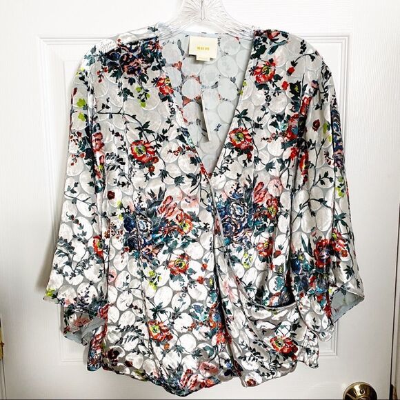 NWT Anthropologie Maeve Umi Silk Velvet Burnout Kimono Top. Size medium. Viscose and silk. Pullover style. Kimono sleeves. Faux wrap style. Generously cut. Approximate hand measurements while garment is laid flat: Bust 20.75”, Length 24.5”