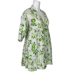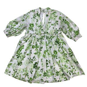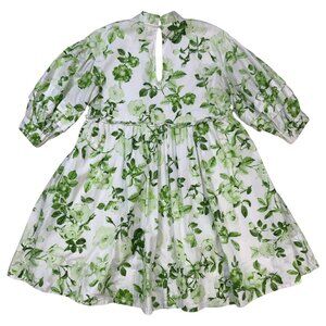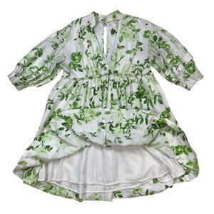 This Anthropologie Maeve women's V-Neck Tunic Mini Dress makes a statement due to it's puff balloon tiered short sleeves, empire waist, babydoll tunic silhouette, elastic cuffs, keyhole button back, pullover relaxed fit, slight high low mini hem, lining, pockets and green/white floral design.