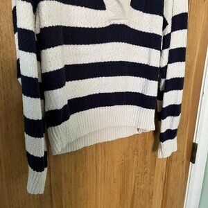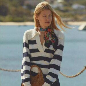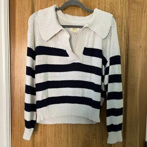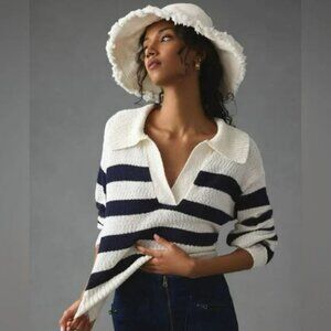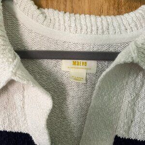 Anthropologie | Maeve V-Neck White & Blue Striped Knit Collared Polo Sweater XL