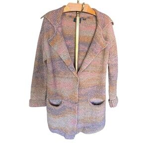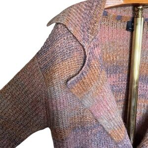 Cozy multicolor striped cardigan. Features a belted waist. Perfect for layering. In good preowned condition. Multi fabric blend including wool, mohair, alpaca.