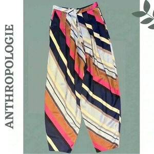 Make a bold statement with these Anthropologie wide-leg pants, featuring a vibrant multicolor geometric stripe print. Designed with a flattering high-rise waist and fluid, relaxed silhouette—perfect for vacation vibes, brunch dates, or dressing up your everyday wardrobe. These flowy trousers are both eye-catching and comfortable, easily paired with a neutral top or fitted blouse.