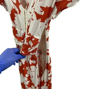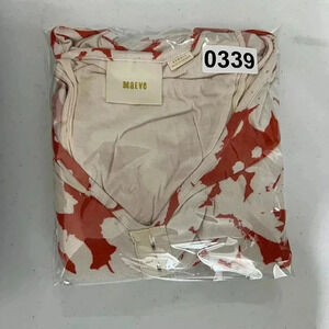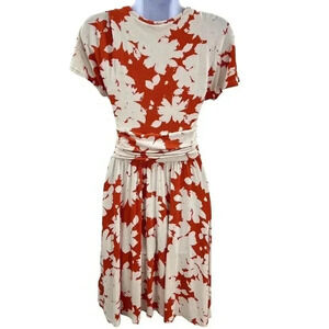 Bright orange and off-white, this Anthropologie Maeve Summer Breeze Jersey Knit dress features a delightful floral print. The XS size ruched waist design is perfect for those warm summer days.