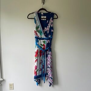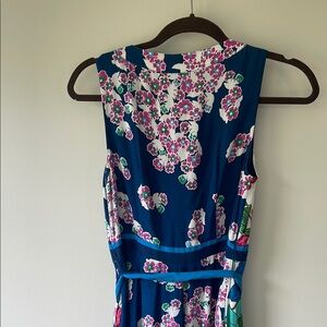 Anthropologie botanica dress Maeve 6p or 2/4 Stylish floral wrap dress with a belt. Features vibrant blue, red, and green floral patterns. I’m usually a 2 or 4 in anthro and this fits well.