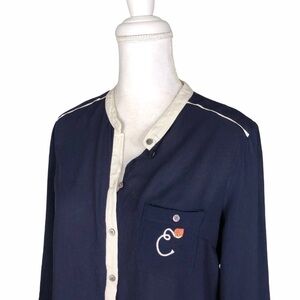 Maeve Anthropologie navy blue button-down top blouse. Embroidered E with orange elephant on breast pocket. Off-white collar, placket, and trim. Cropped sleeves. Lightweight and flowy, 100% rayon fabric. Excellent used condition: no stains, holes, or pills.