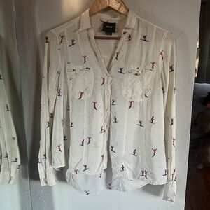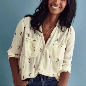 Elegant cream shirt with vibrant red and blue print. Ideal for versatile styling.