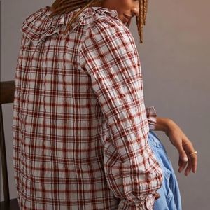 Anthropologie Maeve Ruffled Plaid Buttondown Red Mottif NWT M