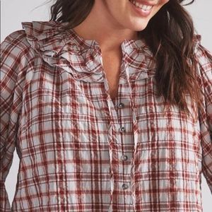 Darling Anthropologie Maeve Ruffled Plaid Buttondown Red Mottif, NWT. Size Medium.